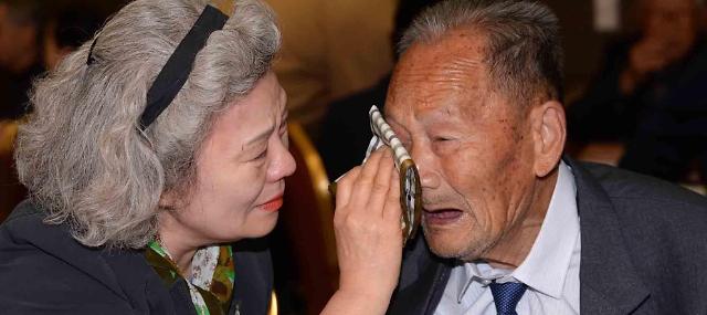 Lee Jeong-suk, 68, with a handkerchief, wipes the tears shed by his 88-year-old North Korean father, Lee Heung-jong, as they bid a farewell each other after the three-day reunions ended at a resort on Mt. Geumgang on North Korea's east coast Thursday. Another round of reunions of families separated by the Korean War (1950-1953) is scheduled Saturday through Monday. In the past 15 years, there have been 20 rounds of face-to-face inter-Korean family reunions.