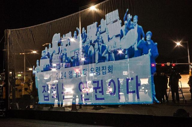 Human right group Amnesty International has staged a "ghost" rally using hologram images of protesters accusing South Korea police of using excessive force to restrict freedom of assembly and expression.