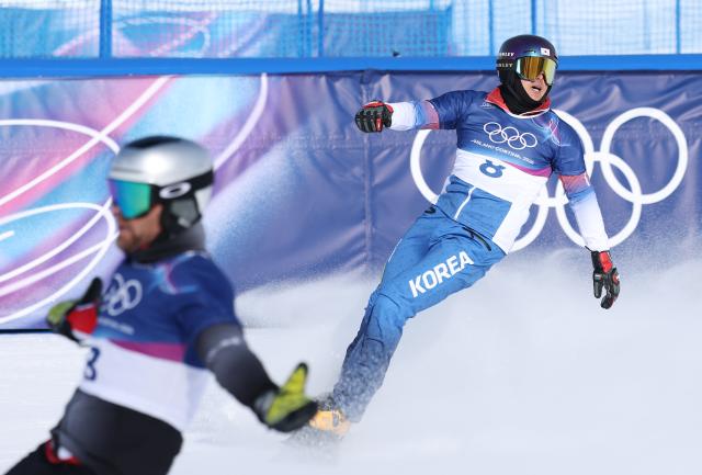 Kim Sang-gyeom crosses the line in second place in the men’s parallel giant slalom final at the Milan-Cortina 2026 Winter Olympics at Livigno Snow Park, Italy, on Saturday (local time).